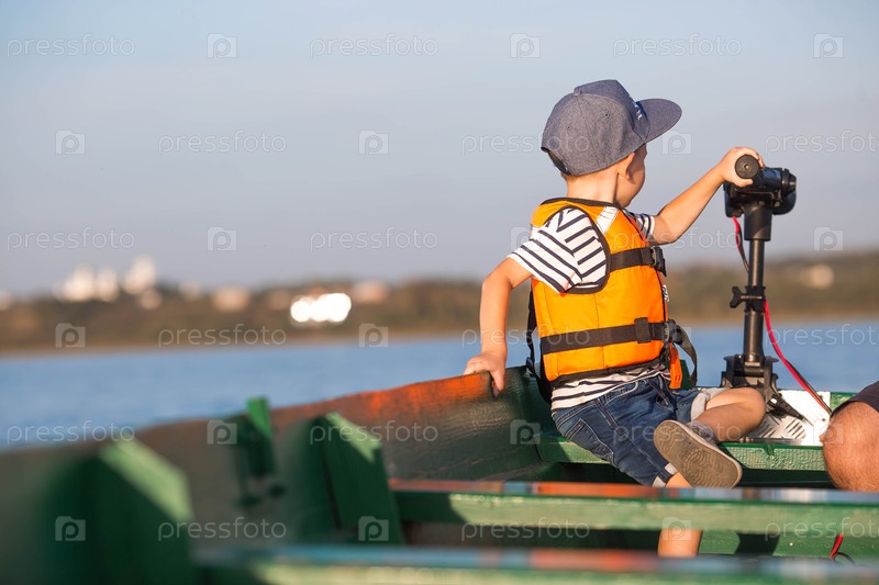 Красивый, модный 5-летний мальчик в ярком спасательном жилете и солнцезащитных очках катается на моторной лодке по озеру на закате. Отдых и туризм