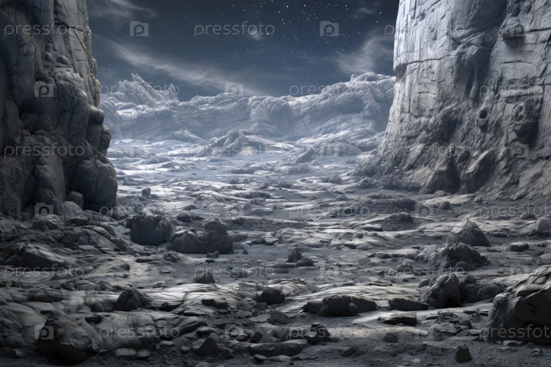 Фантастический космический пейзаж внешней планеты, безжизненная каменистая или ледяная местность под звездным небом и далеким маленьким солнцем