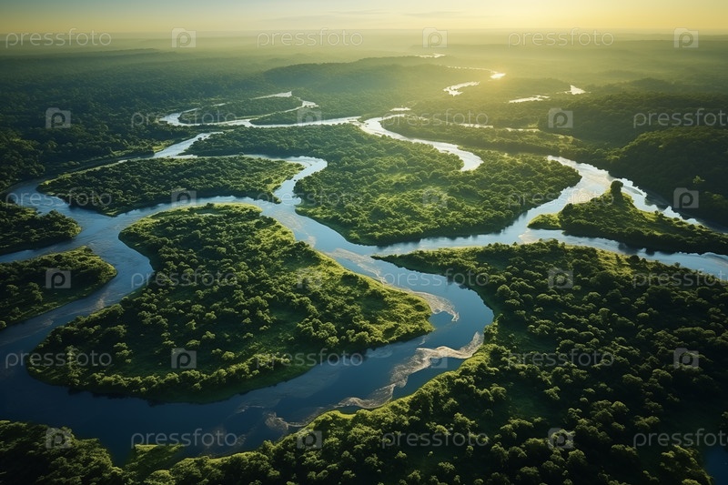 Вид с воздуха на сушу с тропическим лесом и крупной речной системой во время паводка