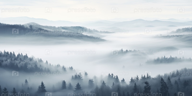 Холмистый ландшафт с туманным хвойным лесом, вид сверху