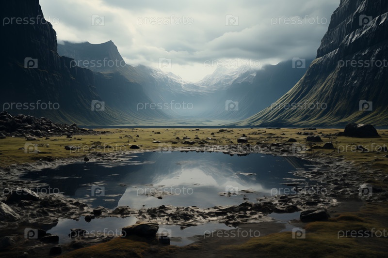 Горный пейзаж, вид на кальдеру потухшего вулкана с озером среди базальтовых скал