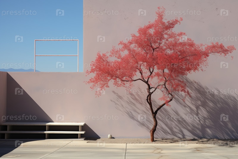 Минималистичный ландшафт современной террасы с розовым цветущим деревом