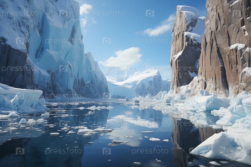 Арктический пейзаж с водой, айсбергами и ледяными скалистыми берегами