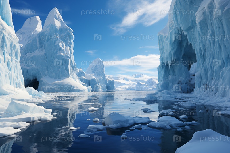 Антарктический морской пейзаж, вид на море между айсбергами и далеким ледяным берегом