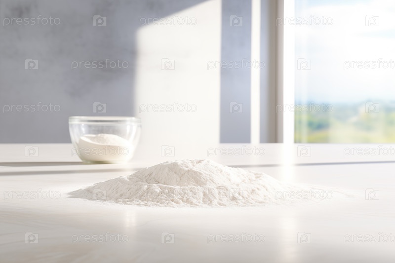 Мука высыпается на стол перед приготовлением в светлой кухне