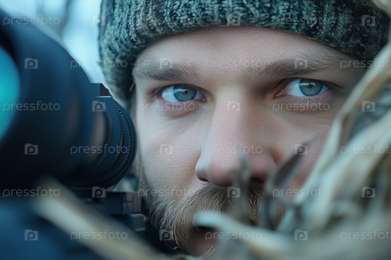 Портрет мужчины в камуфляже с оптическим прицелом в руках