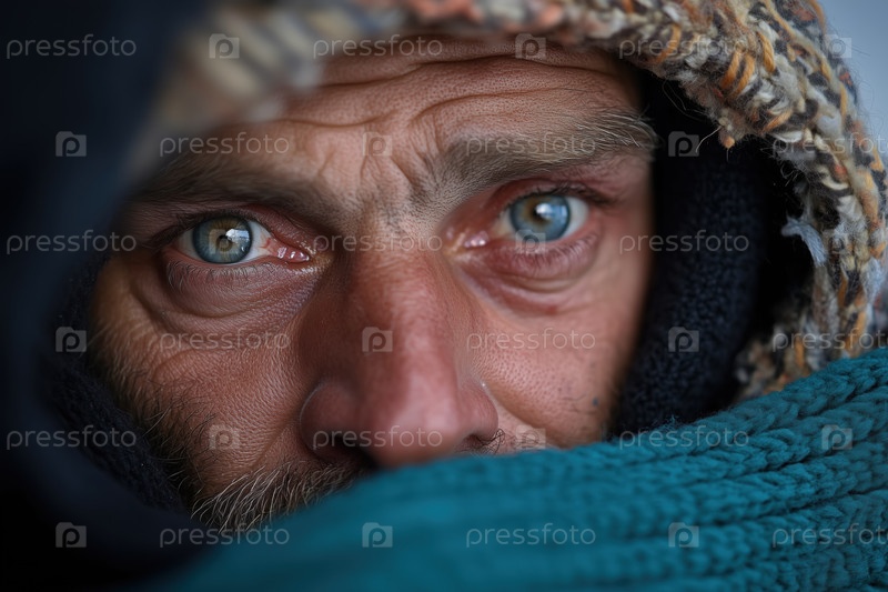 Портрет, взгляд пожилого бездомного мужчины, закутанного в теплую одежду