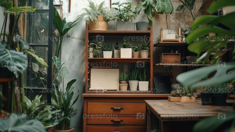 На этом снимке запечатлен тихий внутренний сад, демонстрирующий множество горшечных растений, которые создают успокаивающий оазис, идеально подходящий для превращения любого пространства в зеленое убежище