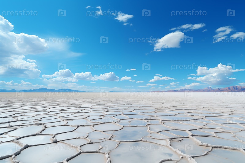 Пейзаж высохшего соляного озера с белой потрескавшейся поверхностью