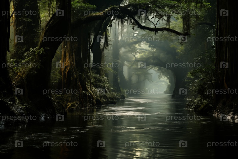 Природный ландшафт, река в тропическом лесу в высокий сезон
