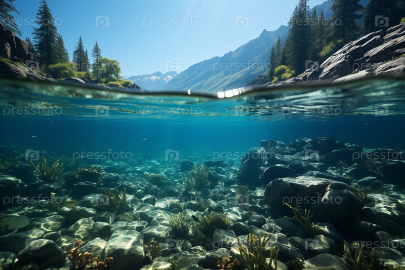 Подводный вид горной реки с водной поверхностью и альпийским фоном