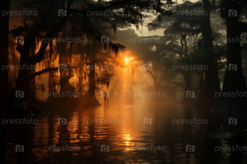 Рассветный пейзаж с рекой в болотистом тропическом лесу, заболоченный лес, затопленный лес