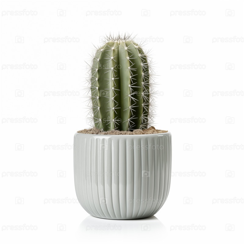 Одиночный кактус в сером горшке на белом фоне