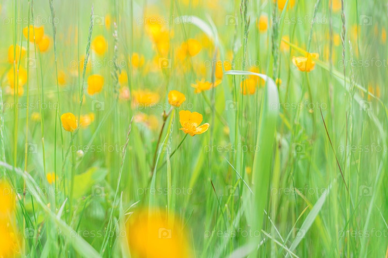 Желтые цветы среди зелени на лугу селективный фокус размытый фон