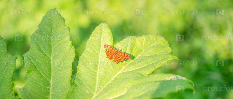 Большая оранжевая бабочка на зеленом листе под летним солнцем