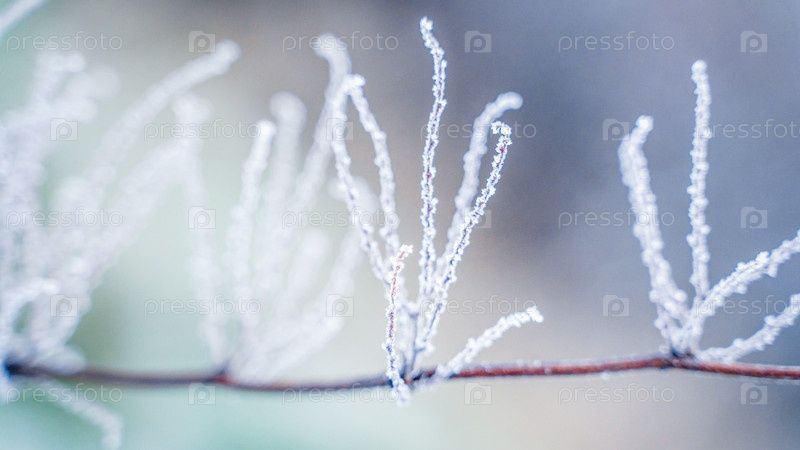 Ветви деревьев, покрытые инеем в морозный зимний день, крупный план
