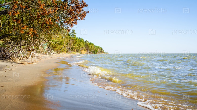 Песчаный пляж и осенний лес в солнечный день