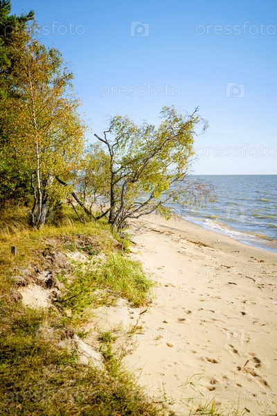 Песчаный пляж и осенний лес в солнечный день