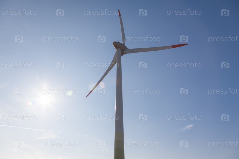 Ветряная турбина с солнечными бликами на фоне голубого неба, вид снизу