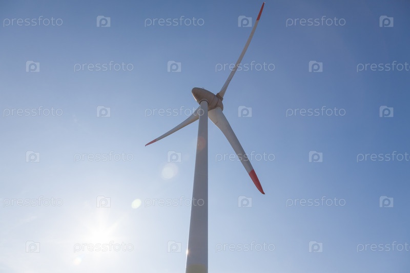 Ветряная турбина с солнечными бликами на фоне голубого неба, вид снизу