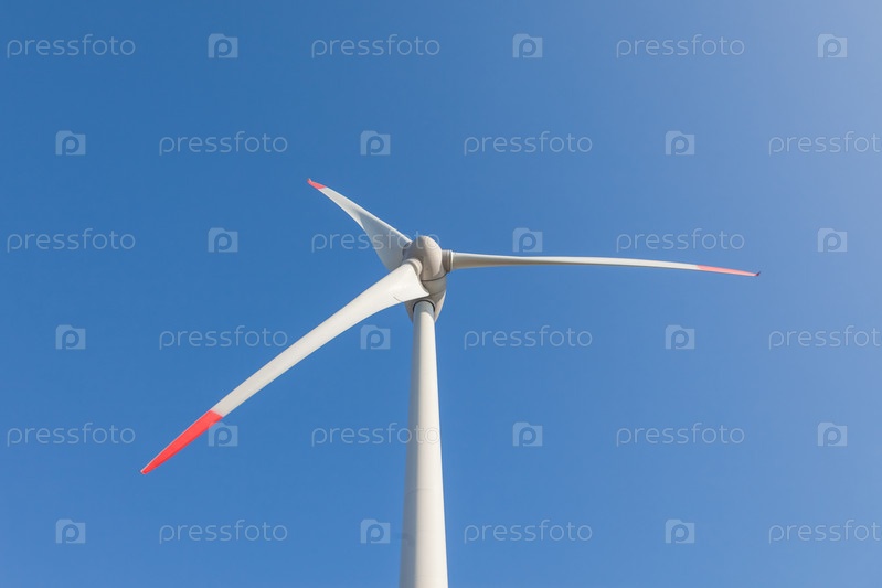 Ветряная турбина с солнечными бликами на фоне голубого неба, вид снизу