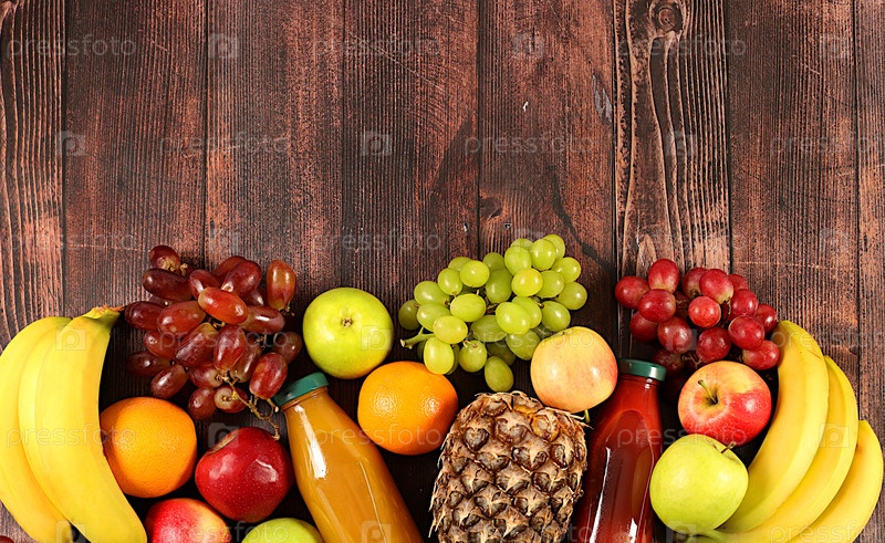 Виноград, апельсины, ананас, яблоки, бананы, орехи и натуральный сок на деревянном фоне, концепция детокс-диеты и потери веса, полезные веганские продукты для здорового образа жизни, реклама магазина