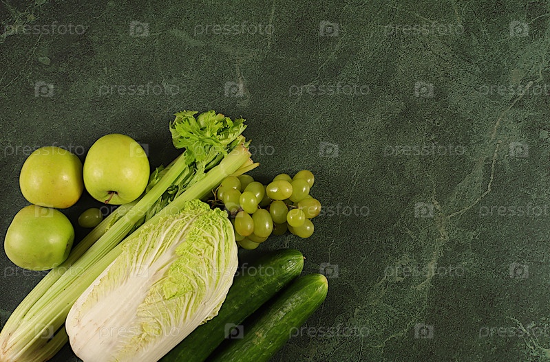 Детокс диета и концепция потери веса, Здоровые веганские продукты для здорового образа жизни. Огурцы, брокколи, капуста, сельдерей, зеленый виноград и яблоки на бетонном фоне, реклама магазина