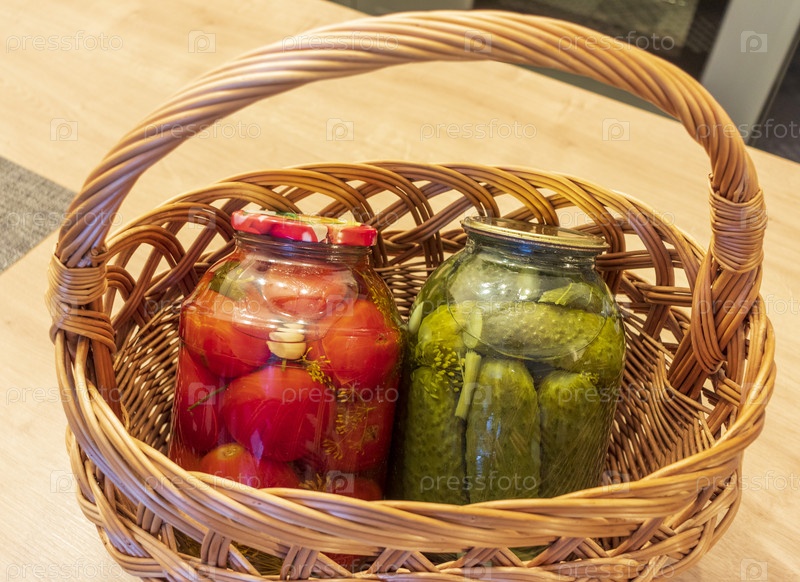 Банки с разными видами солений и варенья в плетеной корзине. Еда