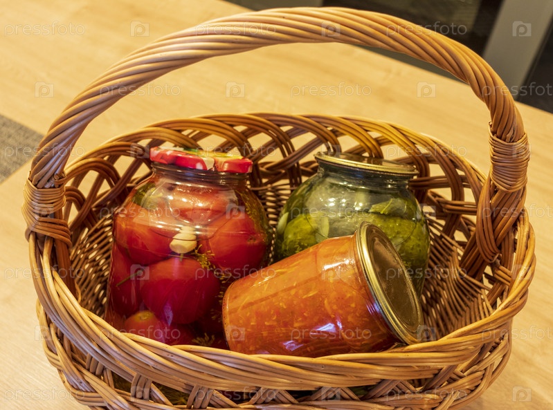 Банки с разными видами солений и варенья в плетеной корзине. Еда