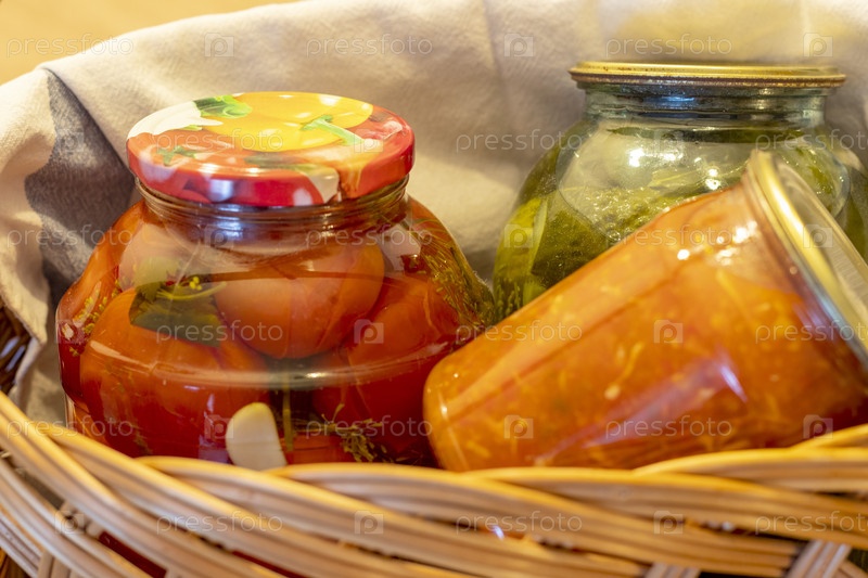 Банки с разными видами солений и варенья в плетеной корзине. Еда