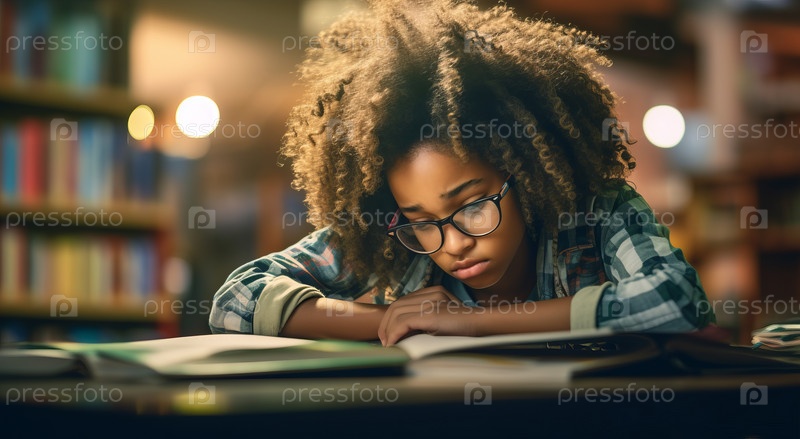 Уставшая студентка сидит в библиотеке, обхватив голову руками. Иллюстрация усталости от тяжелой нагрузки на учебе