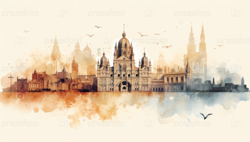 Акварельный всплеск с нарисованным от руки эскизом Ворот Индии Мумбаи, Индия на иллюстрации