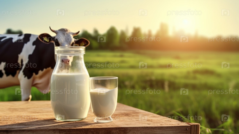 Свежее молоко в стакане на темной деревянной столешнице и размытый пейзаж с коровой на лугу. Здоровое питание. Деревенский стиль. Пространство для дизайна