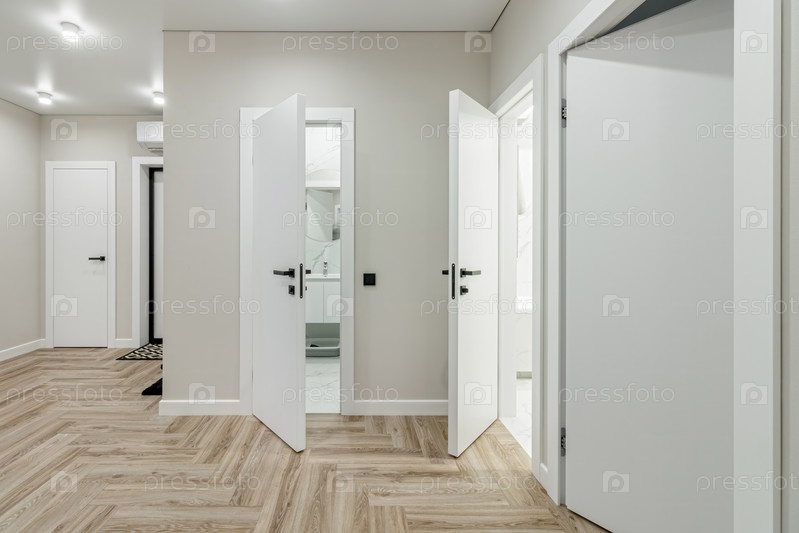 Белая входная дверь в современном отремонтированном коридоре с большими зеркалами и шкафом