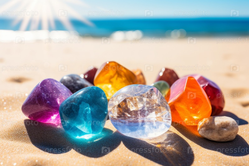 Яркие, красочные стеклянные драгоценные камни сверкают на солнце на песчаном пляже с видом на океан