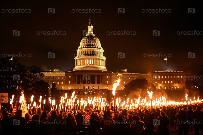 Ночной протест у Капитолия США с факелами и американскими флагами