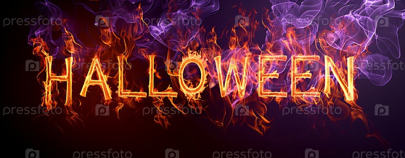Огненный текст на Хэллоуин со светящимся пламенем и таинственным дымом