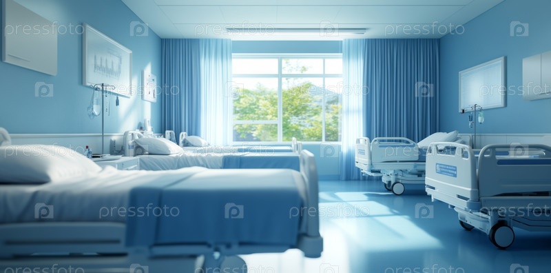 Современная больничная палата с пустыми кроватями и медицинским оборудованием