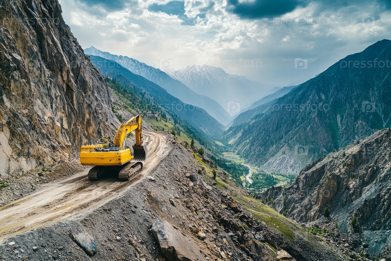Экскаватор неустанно трудится в горной местности, прокладывая себе путь через каменистую местность под ясным голубым небом, демонстрируя сочетание человеческой инженерии и природной красоты