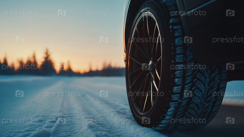 Зимняя шина крупным планом на заснеженной утренней дороге
