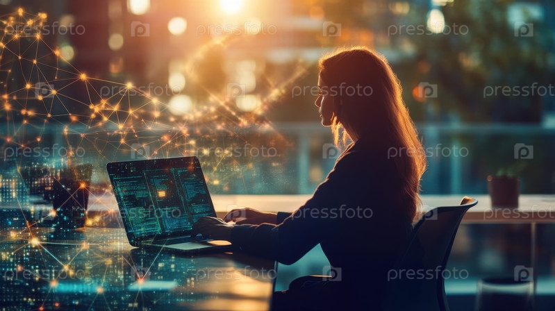 Женщина удаленно работает над кибербезопасностью в офисе Sunset