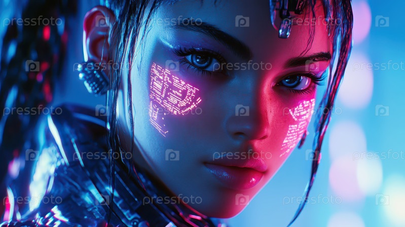 Женщина-киберпанк с неоновыми лицевыми имплантатами