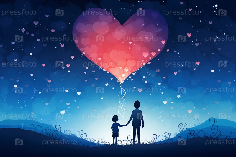 Два силуэта держатся за руки, ребенок маленький и одет в красную рубашку, а взрослый в черную футболку стоит на вершине холма с воздушным шаром в форме сердца в форме дерева, парящим в небе, полным светящихся сердец, летающих вокруг них, романтическая сце