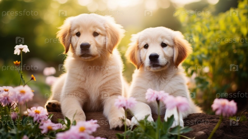 Щенки лабрадора-ретривера сидят среди цветов и зеленой травы