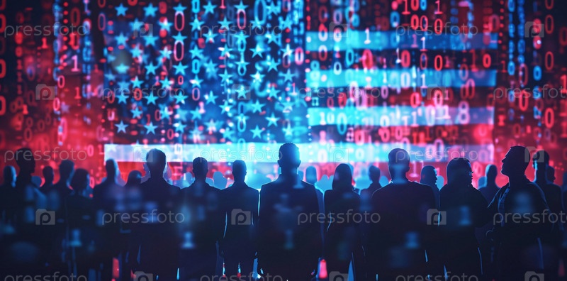 Цифровая эпоха и патриотизм в толпе, стоящей перед киберамериканским флагом