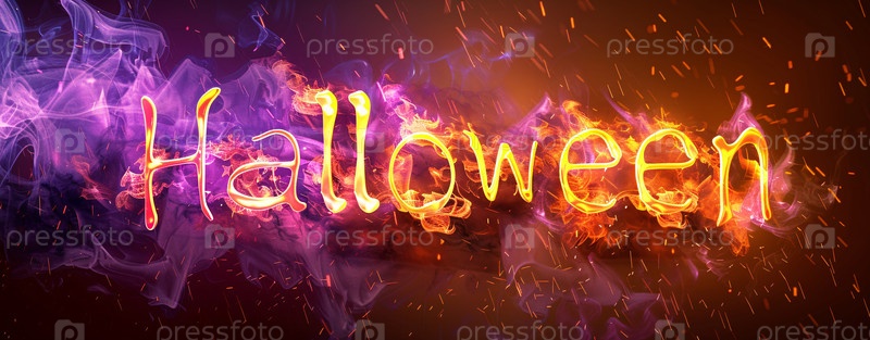 Огненный текст на Хэллоуин со светящимся пламенем и таинственным дымом