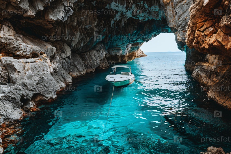 Роскошная яхта, проходящая через Голубую пещеру в живописном месте отдыха на море