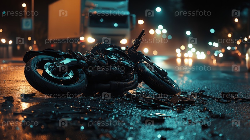 На снимке показаны последствия столкновения мотоцикла и грузовика дождливым вечером, что подчеркивает риск дорожно-транспортных происшествий