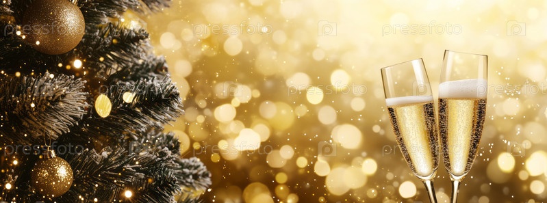 Праздничное изображение двух бокалов шампанского рядом с украшенной рождественской елкой, вызывающее радость и тепло в преддверии Нового года