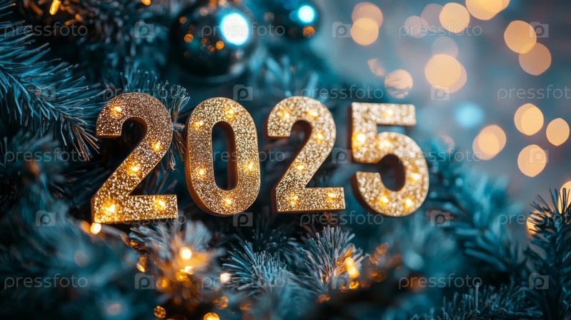 На снимке запечатлена яркая и блестящая атмосфера новогодних праздников с золотыми цифрами 2025 в окружении праздничных украшений и огней боке